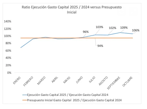 El ejercicio anterior es estrictamente teórico. Veamos ahora la realidad. La ejecución acumulada del gasto de capital a partir de junio no solo superó lo inicialmente presupuestado, sino que también se colocó por encima de los niveles observados en 2024. Estos valores contradicen la idea de que la desaceleración pueda atribuirse a una menor inversión pública.