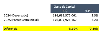 Concentremos el análisis en el corto plazo y hagamos un ejercicio simple y sin mucha rigurosidad. En 2024, el gasto de capital devengado alcanzó alrededor de 2.5% del PIB. En el presupuesto inicial de 2025, el gasto de capital se presupuestó en 2.2% del PIB, lo que implica una reducción de 0.3% del PIB.